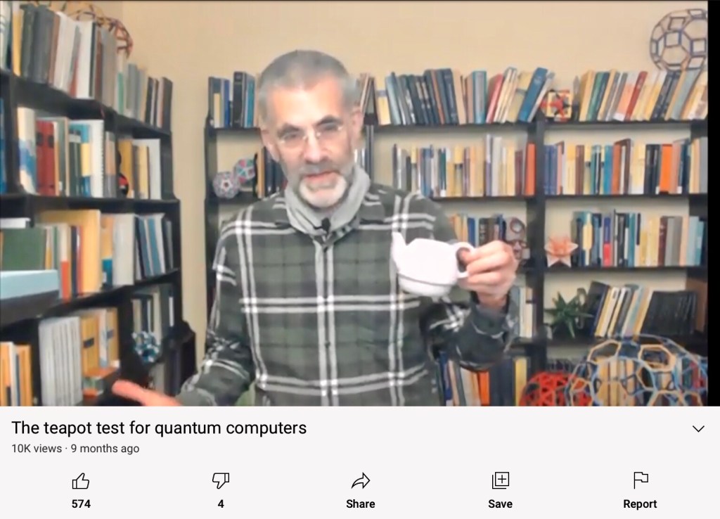 My teapot for example has attained teapot supremacy over classical computers, because there’s a problem it can solve better than classical computers. So quantum supremacy is a kind of really misleading term. It doesn’t actually mean that quantum computers are better at anything useful the point is um quantum computers or for that matter teapots may be really hard to simulate on a classical computer that doesn’t mean they’re useful at computation.