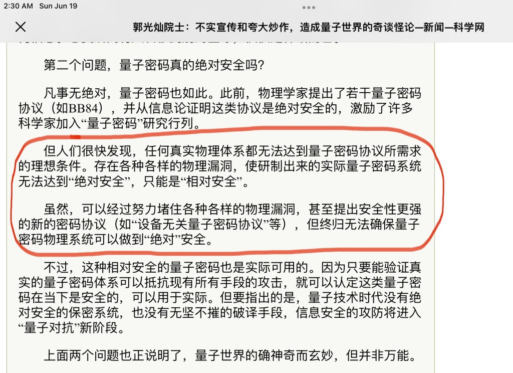 1. 量子密码系统无法达到“绝对安全”,只能是“相对安全”